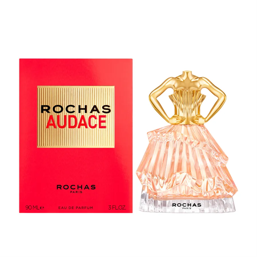 Flakón Rochas Audace je jednoducho jedinečný. Stelesňuje celé dedičstvo značky. Ženská silueta oblečená v ohromných haute-couture bustier šatoch. Lesklé zlaté poprsie postavené ako uzáver flakónu vône. Žiarivé objemné fazetové šaty odrážajú svetlo na všetky smery. Ako trofej ženskosti stelesňuje Rochas Audace ženy, ktoré vynikajú.