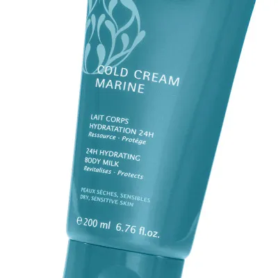 Telové mlieko z radu Cold Cream Marine (24h Hydrating Body Milk) prináša intenzívnu hydratáciu, ktorá vydrží až 24 hodín. Fyziologická náprava dehydrovanej pleti bola dermatologicky dokázaná. * Dodáva pleti zamatový závoj, pružnosť a jemnosť. Vstrebáva sa tak rýchlo, že sa môžete okamžite obliecť. Má sladkú a sviežu vôňu broskýň, zeleného lístia a bieleho pižma.