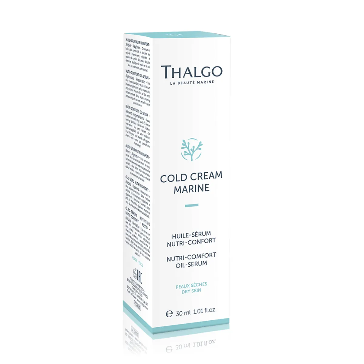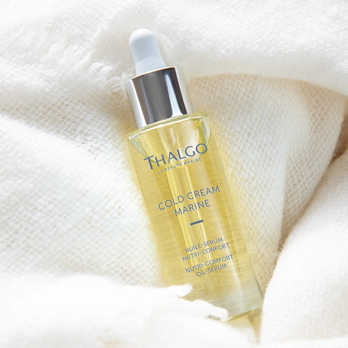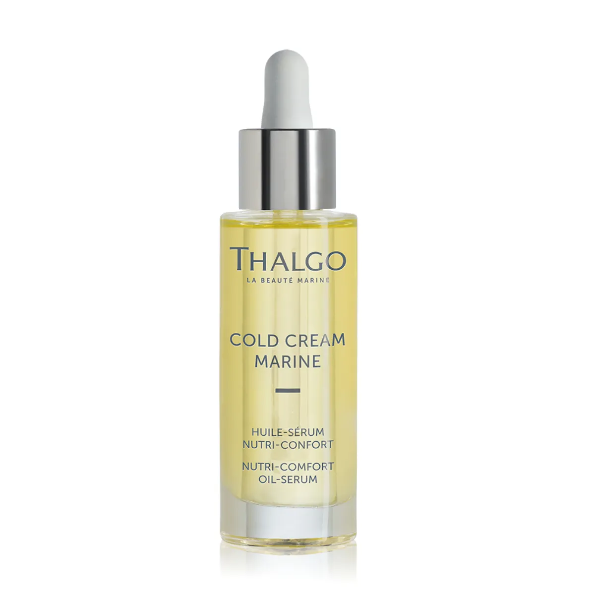 Nutri-Comfort výživné olejové sérum Thalgo Cold Cream Marine s obsahom posilneného vyživujúceho komplexu a morského pro-ceramidu dopĺňa lipidy, prináša suchej pleti intenzívnu výživu a komfort. Obnovuje kožnú bariéru stimuláciou syntézy ceramidu. Pleť je hladšia a známky stárnutia sú redukované. Sérum taktiež obsahuje komplex rastlinných olejov (šípkový, borákový, jojobový), ktoré obnovujú zásoby epidermálnych lipidov a redukujú známky stárnutia vďaka super koncentrovaným mastným kyselinám a antioxidačnému vitamínu E. Senzorická textúra olejového séra nezanecháva mastný finiš. Praktické kvapkadlo umožňuje odmerať ideálne množstvo produktu.