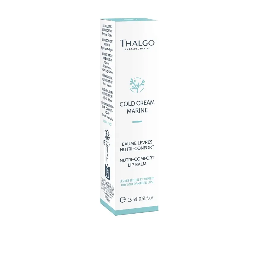 Nutri-Comfort výživný balzám na pery Thalgo Cold Cream Marine s obsahom posilneného vyživujúceho komplexu a morského pro-ceramidu dopĺňa lipidy, prináša suchým perám intenzívnu výživu a komfort. Obnovuje kožnú bariéru stimuláciou syntézy ceramidu. Pery sú hladšie, jemnejšie a menej popraskané. Balzám obohatený o koncentrát bambuckého masla redukuje popraskanie, zvlhčuje suché, poškodené pery a podporuje hojenie. „Masť“ s bohatou, nelepivou, rozplývajúcou sa textúrou má jemnú unisex vôňu s tónmi ambry a vanilky. Zahalí pery pocitom jemnosti. Zošikmená tuba je praktická na nosenie so sebou a aplikáciu kedykoľvek počas dňa.