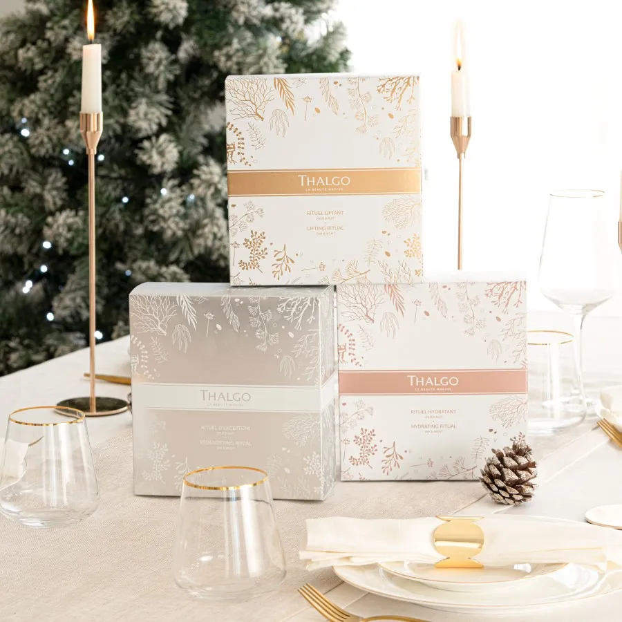 Ponorte sa na magické morské dno s vianočnými setmi THALGO. Sú inšpirované fascinujúcim svetom oceánov a blahodarnými účinkami morských rias. Preskúmajte očarujúce prostredie mora kreatívne stvárnené v dizajne krabičiek. Ich motívom sa prelínajú tri odtiene zlatej, ktoré evokujú nekonečné bohatstvo morského života.