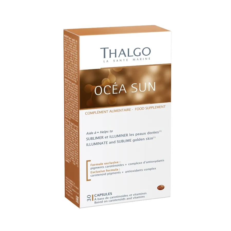 Doplnok stravy Océa Sun v tabletách je novou generáciou ochrany proti slnku. Pomáha získať intenzívnejšie opálenie, chrániť bunky proti oxidatívnemu stresu a chrániť oči. Zostaňte dlhodobo opálená a chráňte svoju pokožku proti starnutiu vďaka antioxidačným účinkom. Dodáva kožným bunkám živiny, ktoré potrebujú počas slnenia. Určené pre každého, kto chce získať dlhodobé opálenie rýchlejšie a pripraviť pokožku a ochrániť oči pred škodlivými slnečnými lúčmi. Odporúčame kombinovať s opaľovacou kozmetikou Thalgo.