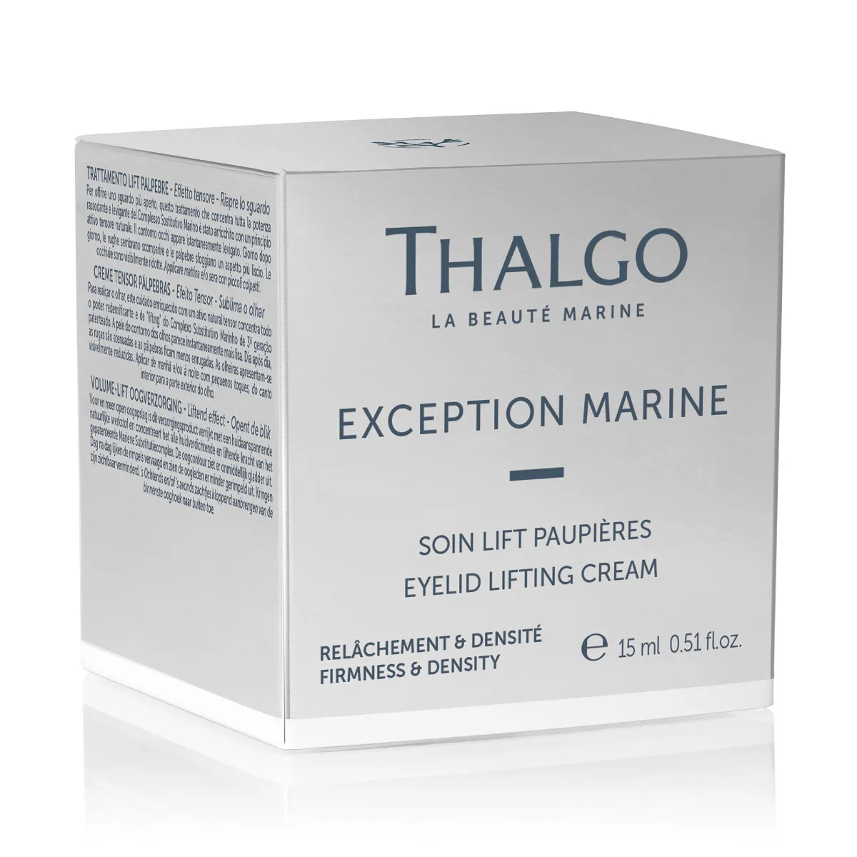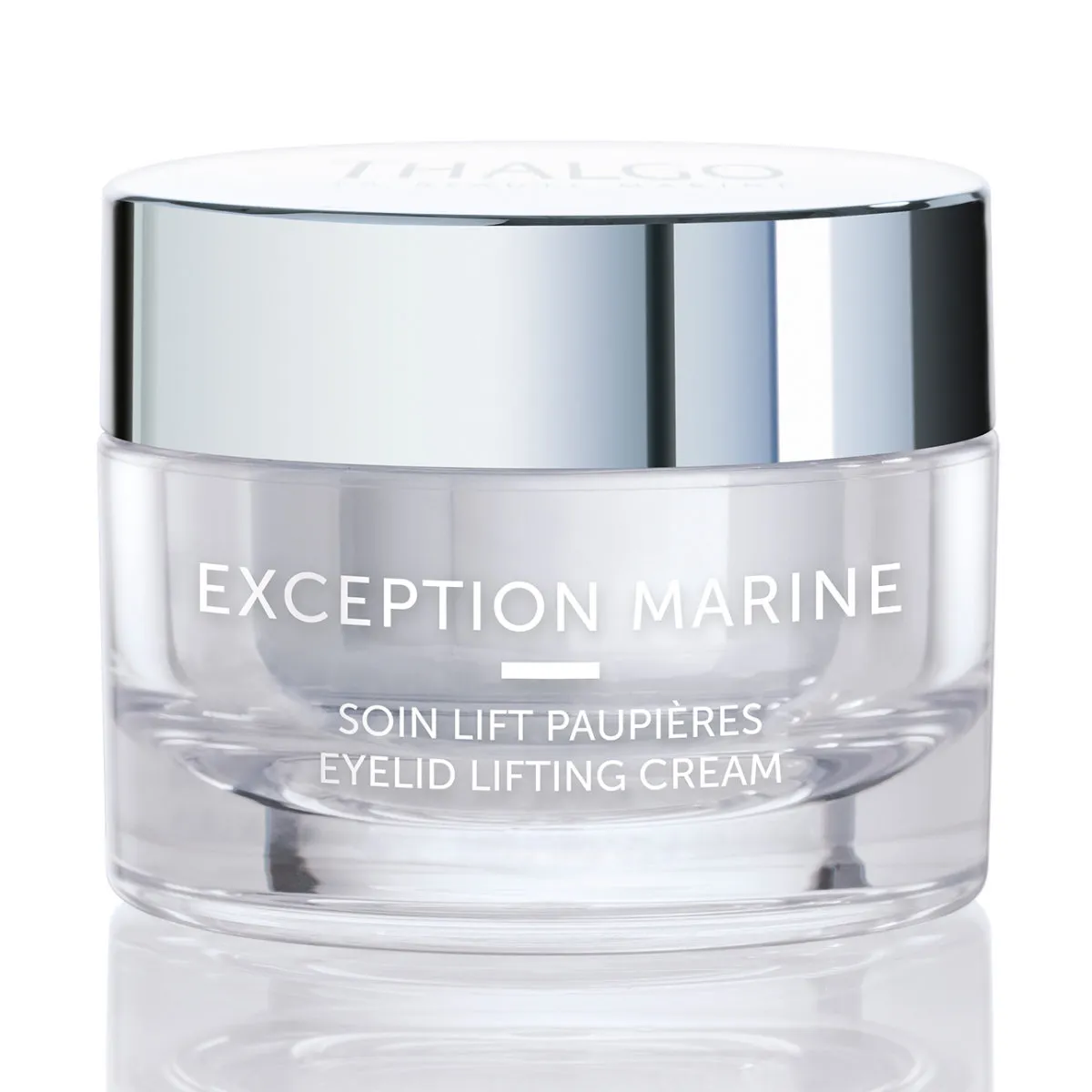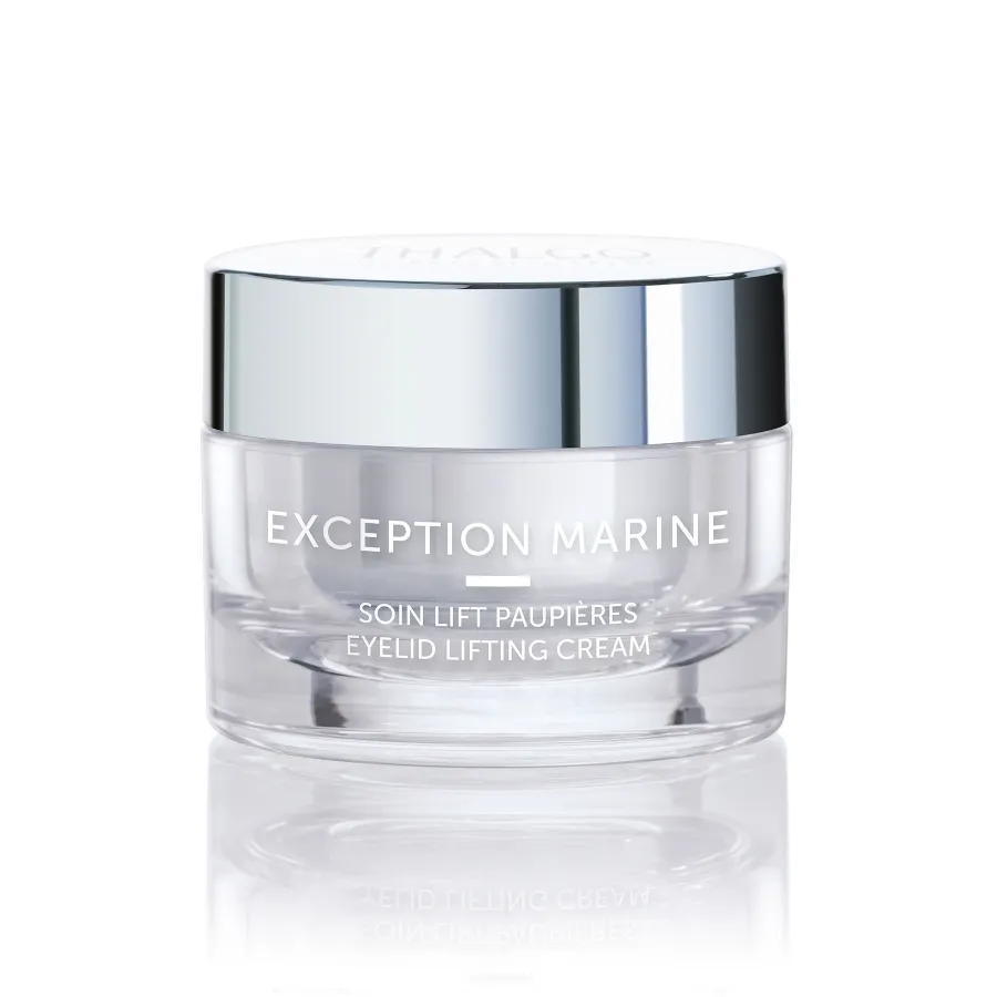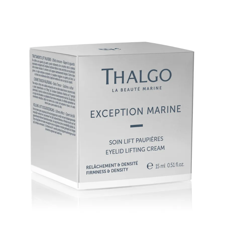 Thalgo Exception Marine Liftingový krém na očné kontúry zvyšuje pevnosť a hustotu povädnutej pleti. Má okamžitý a dlhotrvajúci efekt. Napráva vrásky, tmavé kruhy a opuchy okolo očí. Má príjemnú, krémovú textúru. Okrem patentovaného komplexu Marine Replenishment Complex® pre spevnenie a hustotu obsahuje extrakt z ovsa vysoko koncentrovaný na cukor, ktorý má okamžitý spevňujúci efekt. Ďalej zmes konského pagaštanu a melilotu, ktoré redukujú tmavé kruhy a opuchy.
