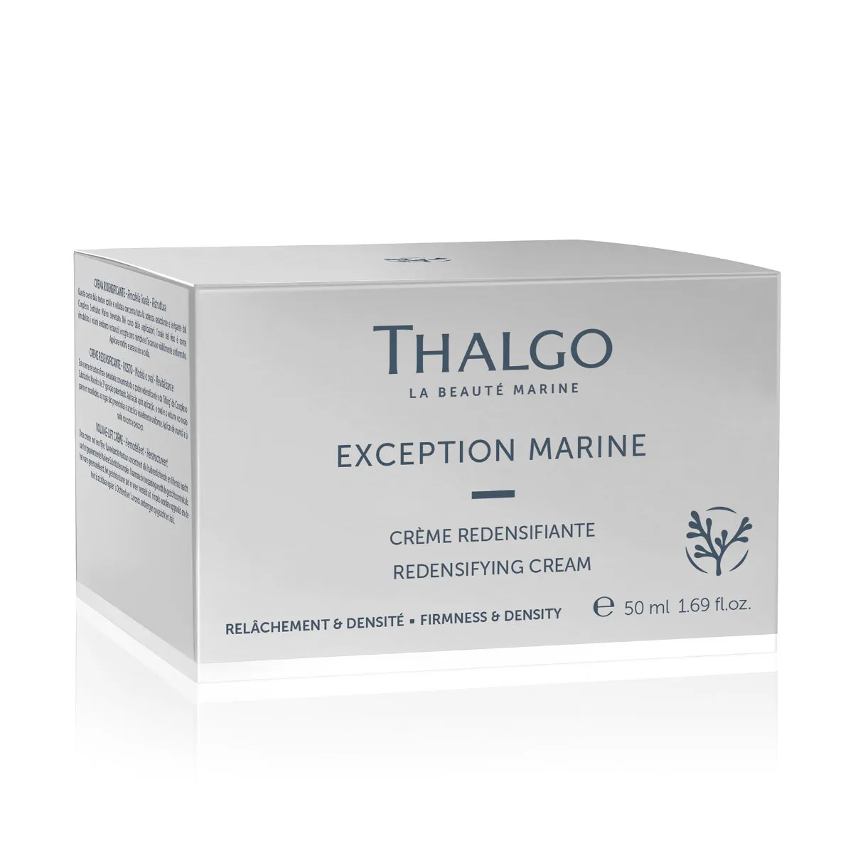 Thalgo Exception Marine Redensifying krém zvyšuje pevnosť a hustotu povädnutej pleti. Obnovuje kontúry tváre, zlepšuje štruktúru a zjednocuje vzhľad pleti. Tento jemný krém je určený pre normálnu až suchú pleť. Krémová textúra obsahuje lipidové aminokyseliny, s ktorými je pleť zamatovo hladká. Krém krásne vonia po bielych kvetoch na základe santalového dreva. Okrem patentovaného komplexu Marine Replenishment Complex® pre spevnenie a hustotu, obsahuje aj extrakt z lekorice, ktorý zjednocuje pleť. (Na suchou až velmi suchou pleť použijte krém Redensifying Rich).