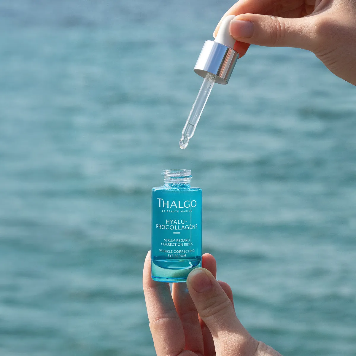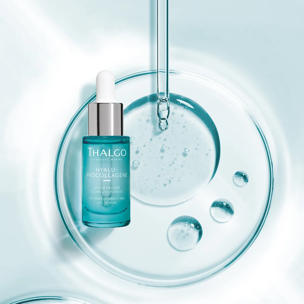 Očné sérum Thalgo Hyalu-Procollagene je inšpirované výskumom morskej biotechnológie a kombinuje morský prokolagén, tri druhy kyseliny hyalurónovej a ferment z morskej baktérie Alteromonas lipotrueae s účinkom podobným botulotoxínu. Sérum uvoľňuje drobné napätie svalov okolo očí, viditeľne redukuje mimické vrásky a zároveň stimuluje syntézu kolagénu I, III a IV pre dlhotrvajúce spevnenie pokožky.