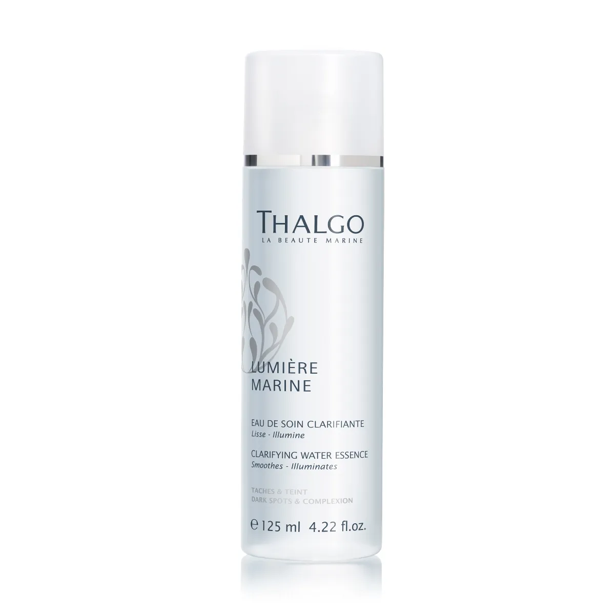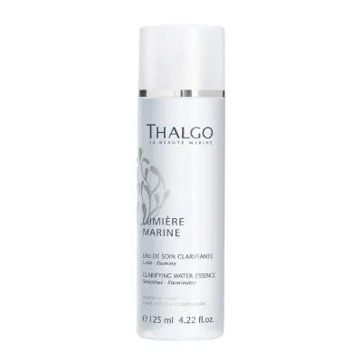 Rozjasňujúca čistiaca esencia Clarifying Water Essence Thalgo vyhladzuje a rozjasňuje pleť. Zjednocuje jej odtieň vďaka extraktu z hnedej riasy. Chráni pleť pred oxidačným environmentálnym stresom, ktorý je príčinou nadmernej pigmentácie a taktiež mdlej pleti. Okamžite vyhladzuje textúru. Podporuje účinky