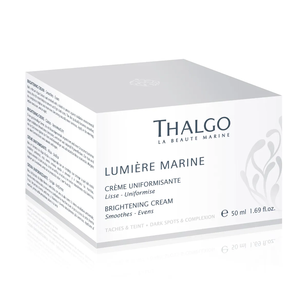 Rozjasňujúci krém proti pigmentovým škvrnám Thalgo Lumiére Marine pôsobí ako naozajstný štít proti environmentálnemu oxidatívnemu stresu, ktorý je príčinou nadmernej pigmentácie a taktiež mdlej pleti. Viditeľne vyhladí pleť, vyrovnáva jej odtieň a obnovuje prirodzený jas. Denne minimalizuje tmavé škvrny vďaka extraktu z hnedej riasy. Obsahuje polysacharidy s vysokou molekulárnou hmotnosťou, ktoré na pleti tvoria odolnú ochrannú sieť. Má ľahkú textúru a jemnú vôňu bavlny a bielych kvetov. Krém je vhodný pre normálnu až suchú pleť. Pre normálnu až zmiešanú pleť je vhodnejší Rozjasňujúce fluidum.