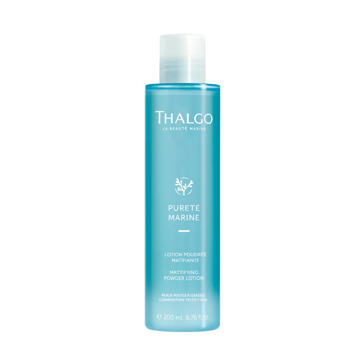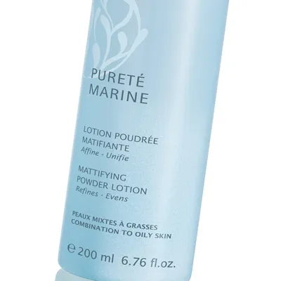 Dvojfázové zmatňujúce púdrové lotion na mastnú a zmiešanú pleť Pureté Marine Thalgo (Mattifying Powder Lotion) vylepšuje textúru pleti a sťahuje póry. Dlhodobo zmatňuje a zjednocuje pleť. Je vhodný pre ženy aj mužov. Viditeľne reguluje lesk už po prvej aplikácii (1*). Vylepšuje textúru pleti už po 21 dňoch používania (2*).