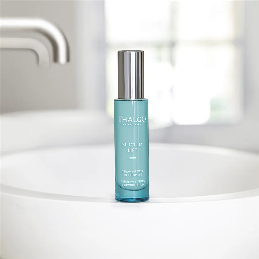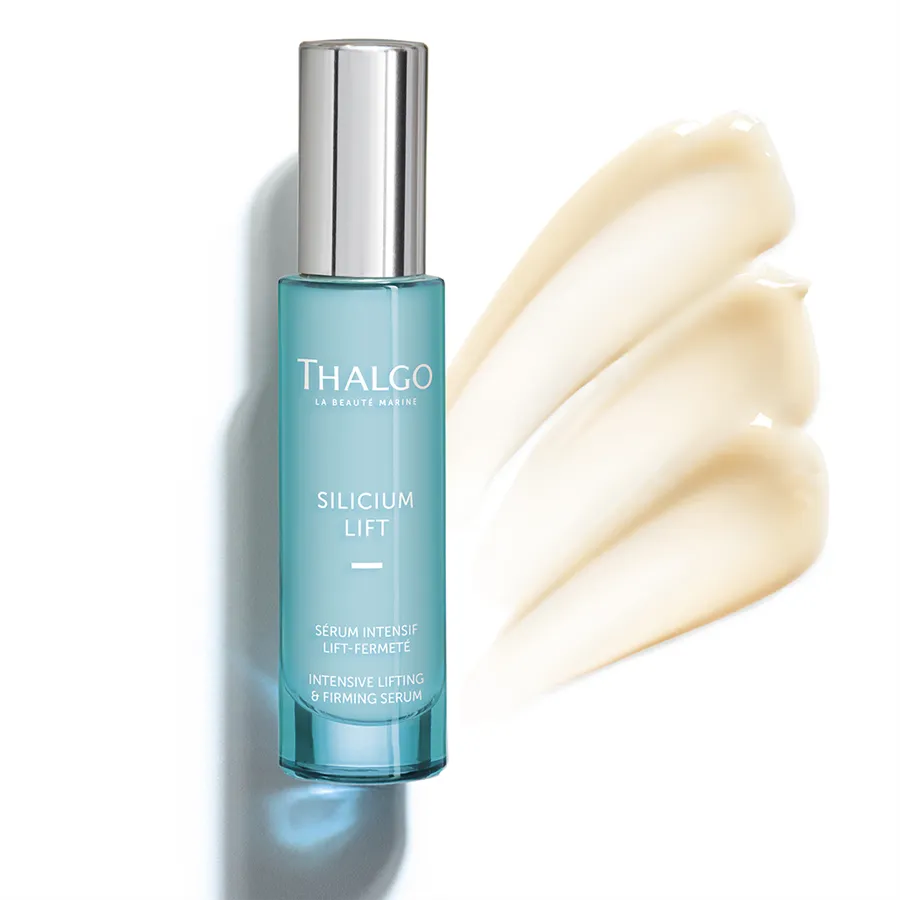 Intenzívne liftingové a spevňujúce sérum Thalgo Silicum Lift s vysokou koncentráciou riasového komplexu bohatého na morské silícium a vitamín C vyhladzuje pleť, navracia jej svieži vzhľad a pozdvihuje kontúry. Extrakt hnedej riasy Pelvetia canaliculata obnovuje pružnosť pleti. Potláča enzýmy zodpovedné za rozklad elastínu a stimuluje syntézu kolagénu a kyseliny hyaluronovej. Ľahká mliečna emulzia s jemne oranžovou farbou sa rozplýva na pleti.